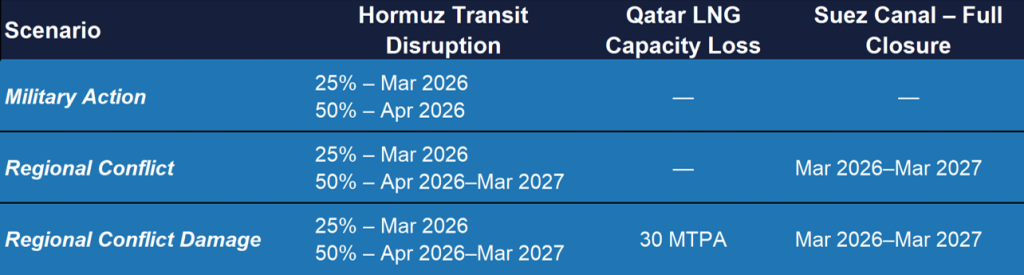 The first scenario, Military Action, assumes a short conflict lasting two months. The second scenario, Regional Conflict, models a more prolonged escalation in which LNG trade via the Strait of Hormuz is curtailed by 50% for 12 months.