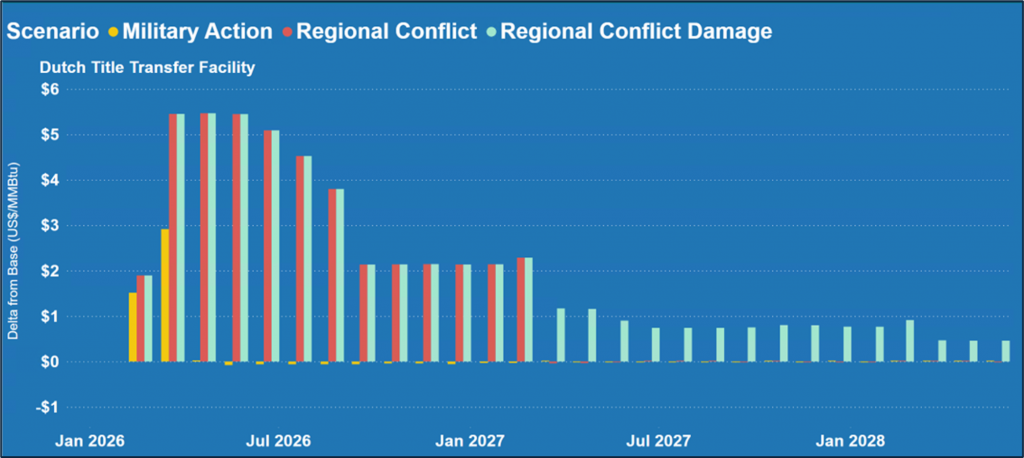 The impact on TTF prices under each scenario is shown in Figure 1, below. In the Military Action scenario, TTF prices rise by approximately USD2–3/MMBtu, reflecting the limited duration of the disruption. In the Regional Conflict scenario, the increase relative to the Base Case peaks at over USD 5.50/MMBtu in summer 2026 before moderating to around $2/MMBtu during the 2026–2027 winter.