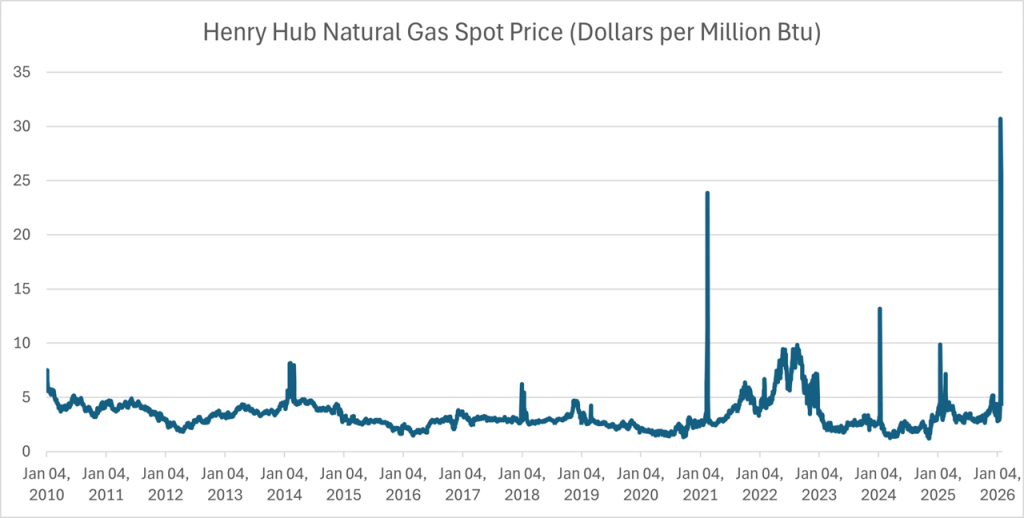 And boy did it. Two thirds of the country was ravaged (see Figure 2 below) by a major winter storm, nicknamed “Fern,” at the end of January 2026, dropping snow and leaving prolonged cold in its wake. Pittsburgh, PA experienced 18 straight days where the high temperature did not exceed freezing. What does this mean for natural gas markets? A lot.